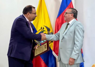 El evento inició con los acordes del Himno Nacional y las palabras del pastor Rómulo Sánchez, que marcaron el espíritu de unidad y compromiso. Posteriormente, el Consejo de Regentes y el canciller MsC. Freddy Baño entregaron las credenciales que simbolizan el inicio de una gestión orientada a la excelencia académica, la innovación en turismo y el bienestar de toda la comunidad universitaria.